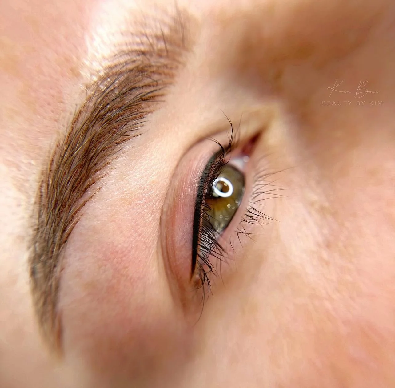 Semi-permanent eyeliner is a form of an eyeliner tattoo. A fine line through the top or bottom lash line and the eyelid that gives the appearance of more lashes and defines the eyes. This style is very subtle and natural.